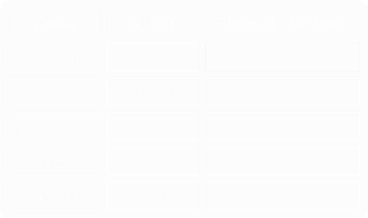Forward-thinking businesses are now scaling through remote, white label teams—accessing premium talent without taking on the full-time cost and complexity of in-house hiring.