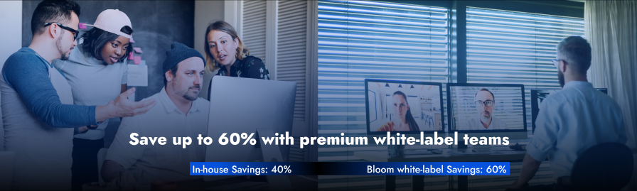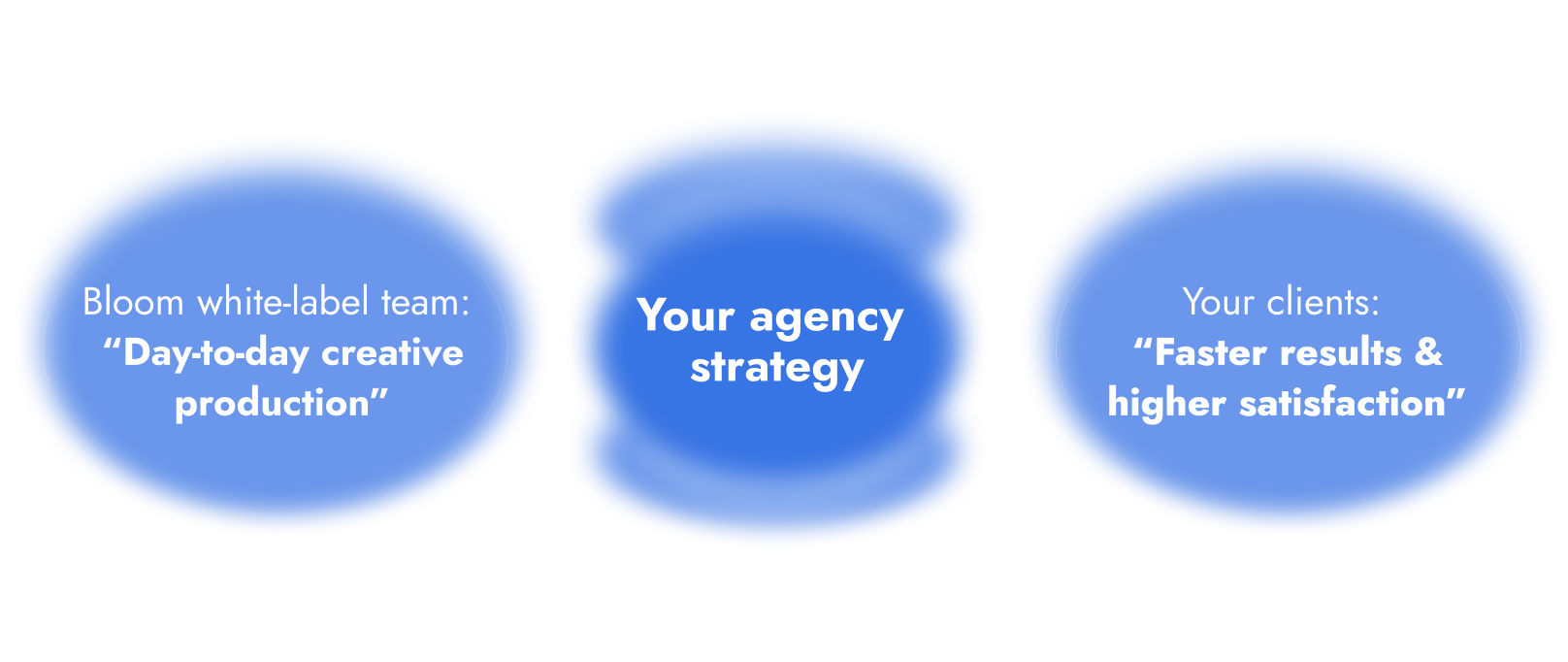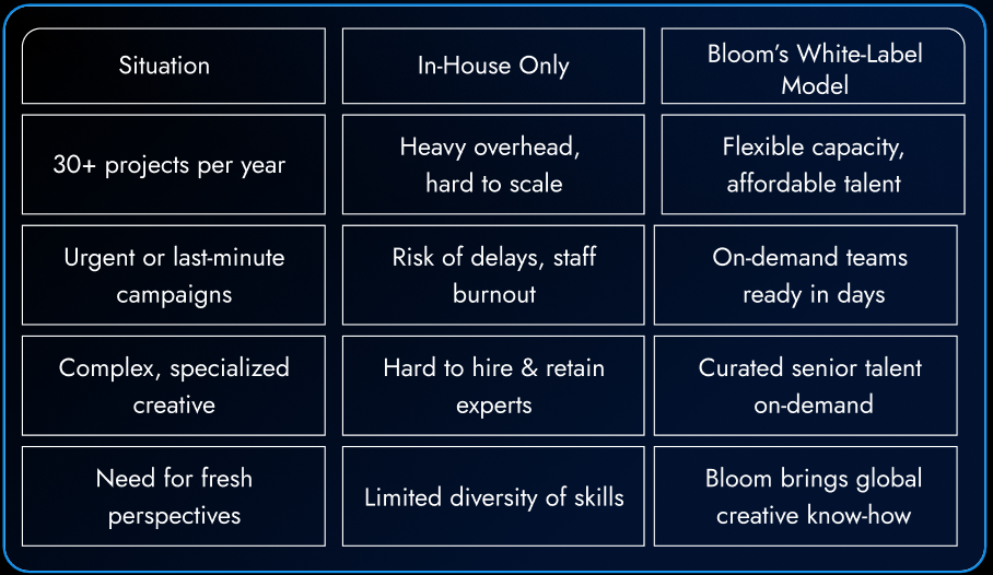 At Bloom, we provide a complete, scalable creative team for a fraction of that investment. Our white-label model helps you keep your fixed costs lean while accessing top-tier professionals ready to deliver — meaning you can grow your agency’s profitability with peace of mind.